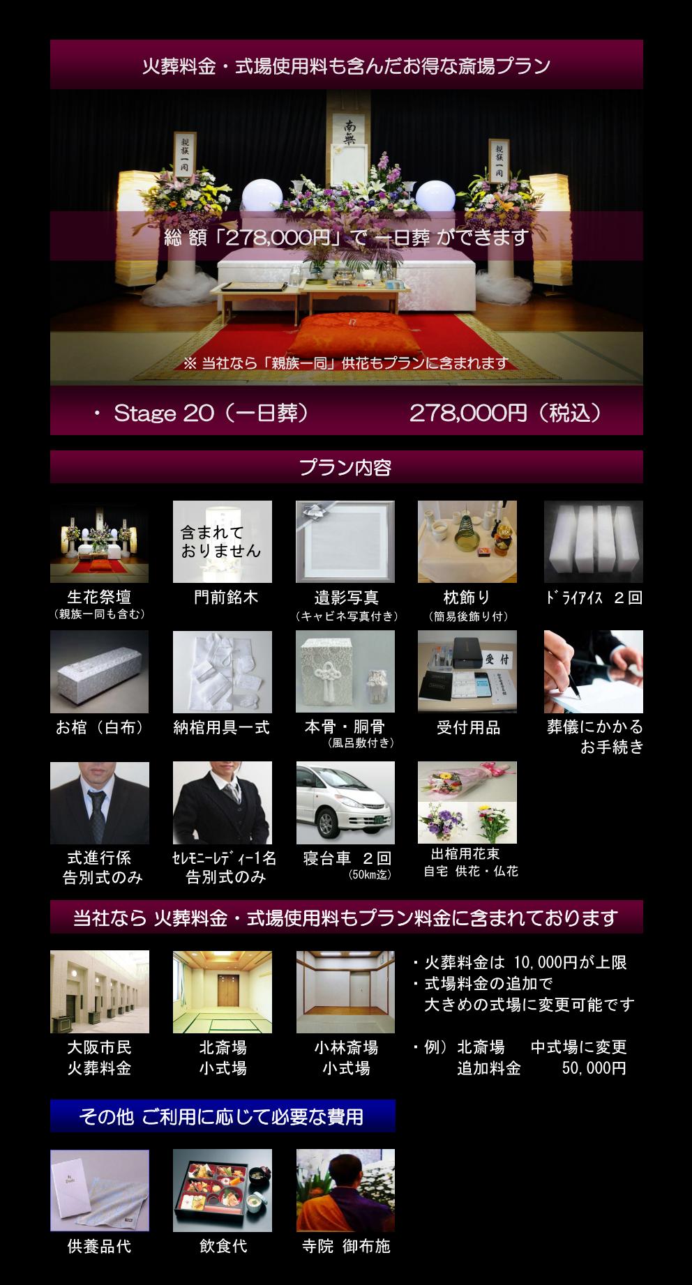 当社の直葬プランには、大阪市民の方なら火葬料金のみの追加料金で総額109,000円で火葬することができます。葬儀費用を安くするポイントは、プラン料金で葬儀ができるのか?が大事なポイントとなります。費用を安く見せかけるために、中身のないプランが多数存在しております。プラン料金が安くても、追加費用が多額になっては本末転倒です。本当に大事なのは、プラン料金だけで火葬がおこなえるのかがポイントです。
